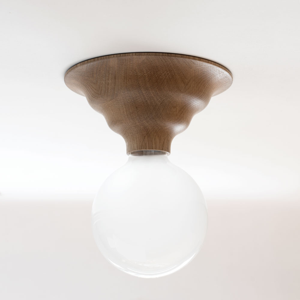 If SKALA is also chosen in stained rose or yellow the lamp becomes a colored reflector creating a pleasantly atmospheric light. With the white stain the SKALA ceiling and wall light takes on the appearance of stucco decoration and is an ideal choice especially in classic older buildings. The wood grain remains visible through the matte and eco-friendly chalk paint and underlines the unique character of this design object. SKALA also develops a natural charm in oiled natural wood and can be beautifully combined with wooden floors, doors or even half-timbered walls.